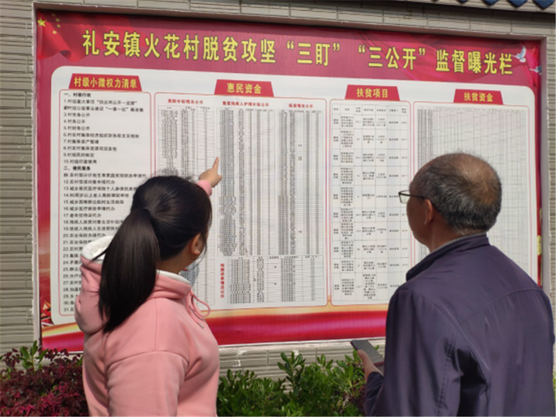 | | 礼安镇火花村村民正在看“三盯“”三公开”监督曝光栏 |