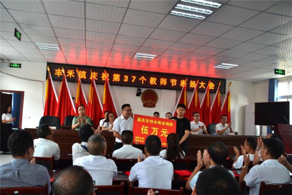 表彰会上先进教育工作者代表丰禾镇初级中学校长张文军、丰禾镇中心小学优秀班主任代表王绍余、丰禾中学优秀教师代表范晓玲在会上做了交流发言。 庆祝会上,重庆市邻水商会向丰禾镇捐赠5万元、纵宇建设集团有限公司捐赠2万元,用于关心、慰问丰禾镇辖区优秀教师,支持丰禾镇教育事业发展,丰禾镇党委书记王波代表镇政府接受了捐赠。 庆祝会上,重庆邻水商会监事会主席李族坤对丰禾镇教育事业支持做了表态发言。