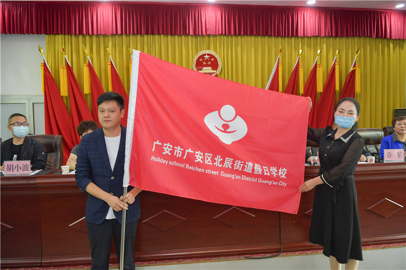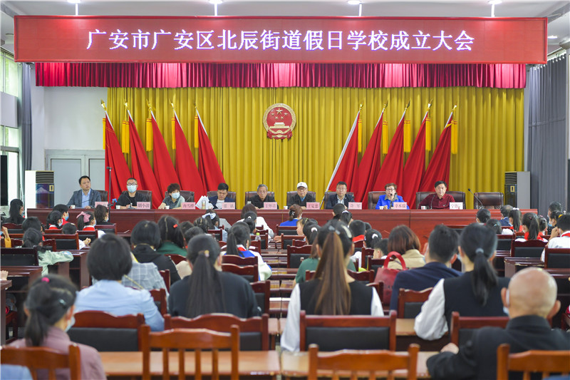 成立大会上,北辰街道党工委组织委员杨航宣读了《中共广安市广安区北辰街道工作委员会关于成立广安区北辰街道假日学校的决定》,北辰街道党工委副书记胡小波在大会上致辞,广安区关工委执行主任王怀清为“假日学校”授牌,北辰街道党工委书记张讯为“假日学校”授旗,假日学校辅导老师代表和学生代表进行了宣誓,假日学校校长辛本瑞,广安爱乐艺术学校董事长、校长许军,区关工委执行主任王怀清等先后讲话。