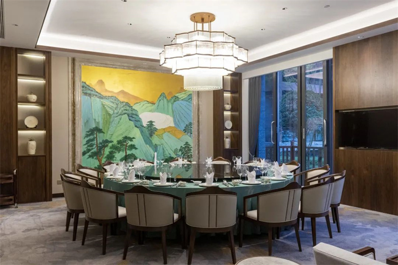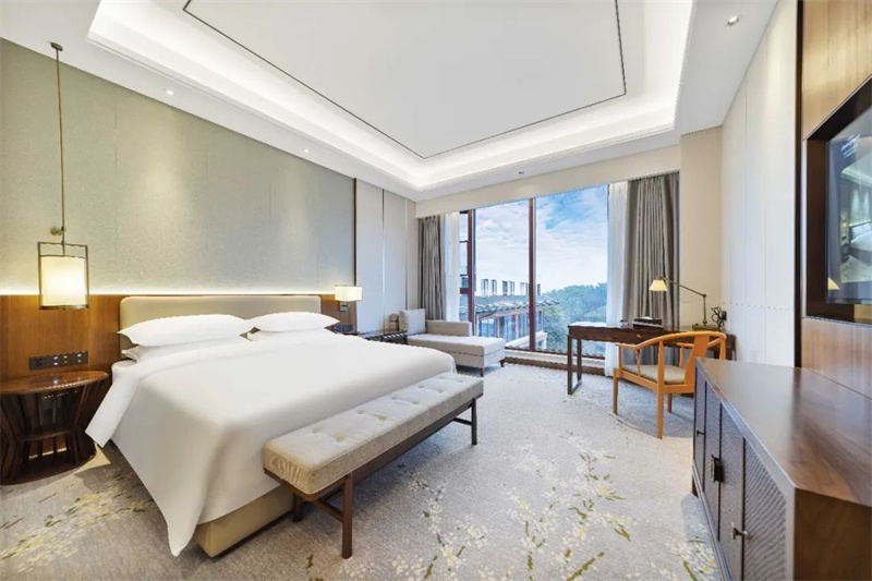 客房以贴合自然感受的材质,利用自然元素、色彩、融合至空间,营造让人放松的环境。166间客房都是以“新中式”的设计理念,选用英国皇室专享床具品牌“斯林百兰(Slumberland)”,洁具采用全球领先品牌——德国高仪,配备55英寸飞利浦大屏幕液晶电视,全域高速WIFI让宾客畅行网络,设有干湿分区的淋浴间,180°落地窗,让神龙山景致尽收眼底。