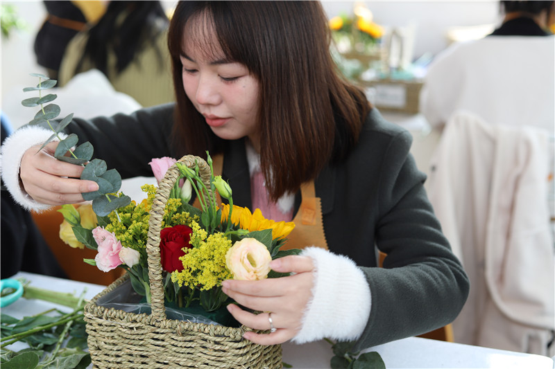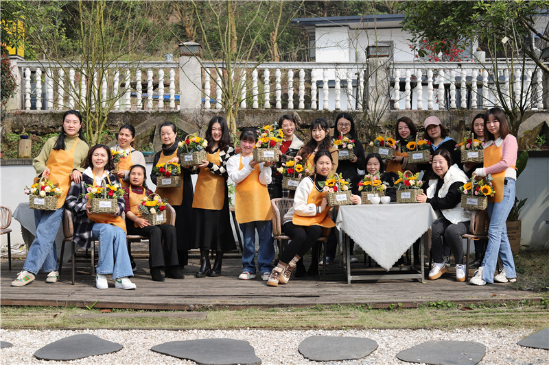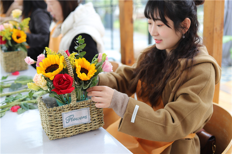 一捧鲜花展笑颜。“向日葵象征着信念和忠诚…”通过花艺老师深入浅出的讲解,大家制作出了一篮篮精美的插花,大家用灵巧的双手,诠释了愉快工作、幸福生活的美好状态。
