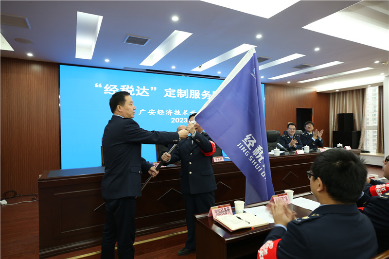 区局党委书记、局长赵国勇为“经税达”定制服务队授旗。接过旗帜,区局“经税达”定制服务队副队长李昱带领全体队员庄严宣誓,并作出表态:我们将精心服务纳税人缴费人,精准落实税费政策,勇于创新、精益求精,让政策直达快享,让服务便捷舒心,全力打造更简、更快、更准、更优的经税服务体系,为推动广安经开税收现代化而不懈努力……表态铿锵,信心满满。