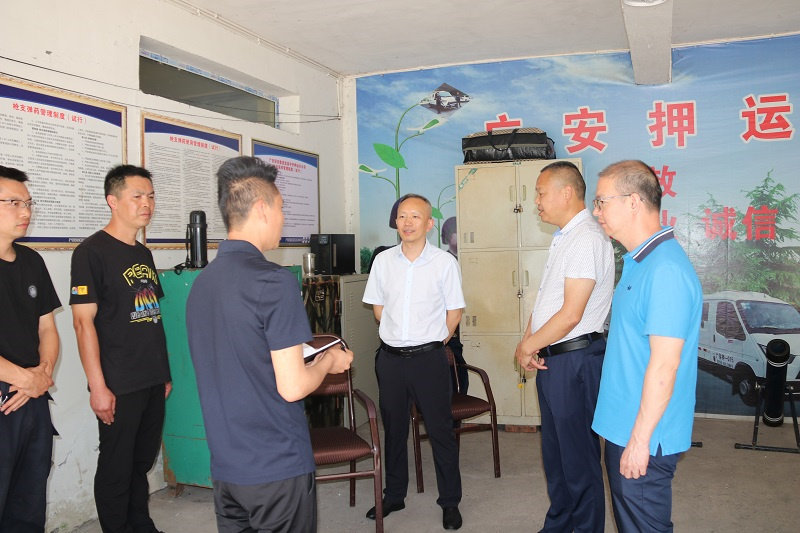在保安集团押运基地,易国华听取了工作汇报,重点检查了安全生产制度落实情况、安全培训资料、人员值班表、消防设施设备的完善性、应急预案落实情况、枪支弹药领取台账等内容。