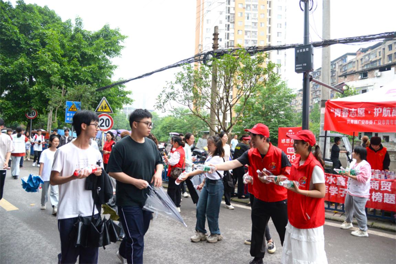 当天,志愿者们早早来到邻水县第二中学旁,设立起爱心助考志愿服务点,同时提前准备矿泉水、扇子等防暑降温物资,为广大考生轻松迎考做好充足的后勤保障。