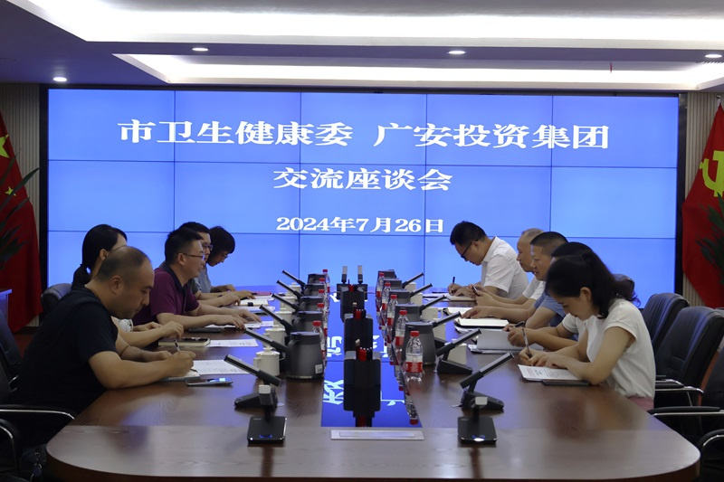 四川新闻网消息 7月26日下午,广安市卫生健康委党组书记、主任蒋志虎到广安投资集团就推进合作事项开展座谈交流,投资集团党委书记、董事长杨远鹏,投资集团副总经理、大数据集团董事长李余,投资集团副总经理、金澳实业执行董事易国华,市卫生健康委有关科室负责人、投资集团相关子企业负责人参加座谈。