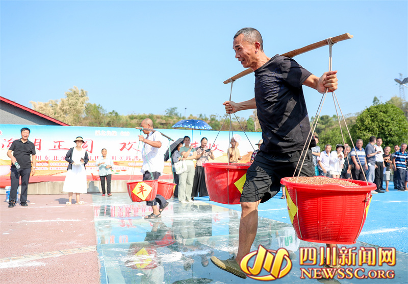 | 9月14日,四川省广安华蓥市溪口镇和重庆市合川区三汇镇的群众,在袁家坝村参加趣味活动挑高粱比赛,在开心中迎接中秋节、中国农民丰收节和国庆节。 |