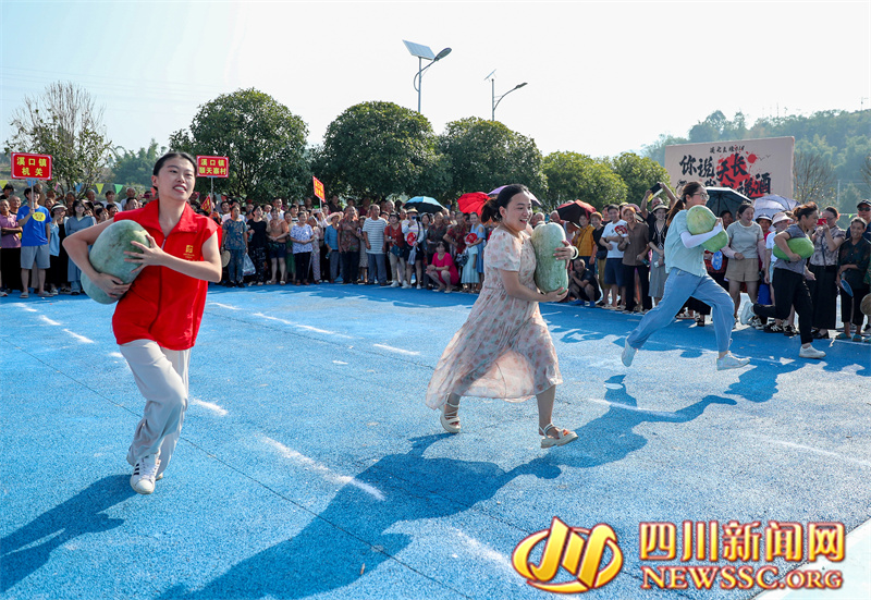 | 9月14日,四川省广安华蓥市溪口镇和重庆市合川区三汇镇的群众,在袁家坝村参加趣味活动运冬瓜比赛,在开心中迎接中秋节、中国农民丰收节和国庆节。 |