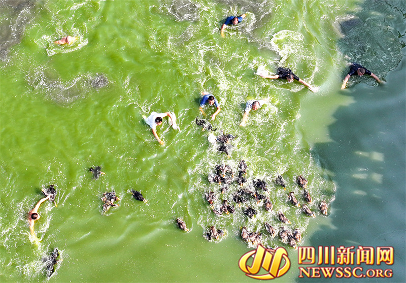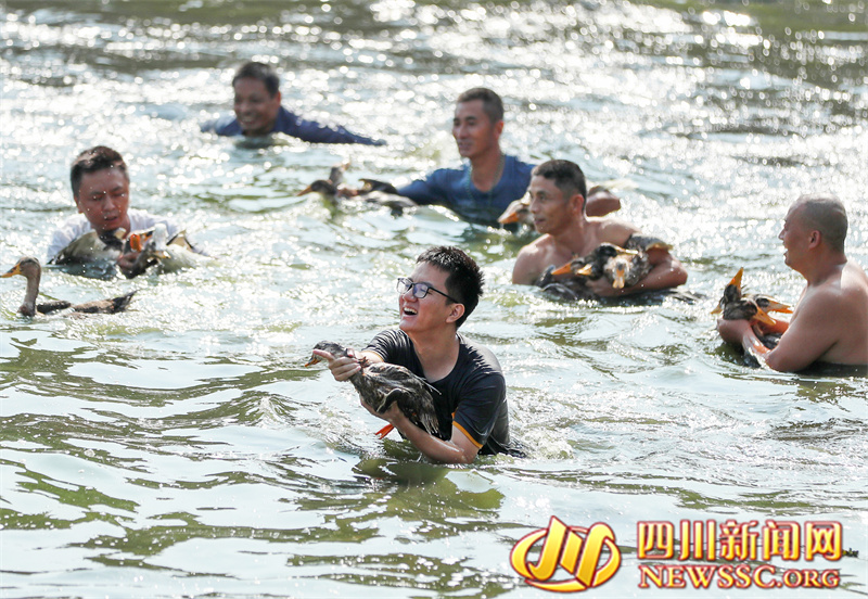 | 9月14日,四川省广安华蓥市溪口镇和重庆市合川区三汇镇的群众,在袁家坝村参加趣味活动捉鸭子比赛,在开心中迎接中秋节、中国农民丰收节和国庆节。 |