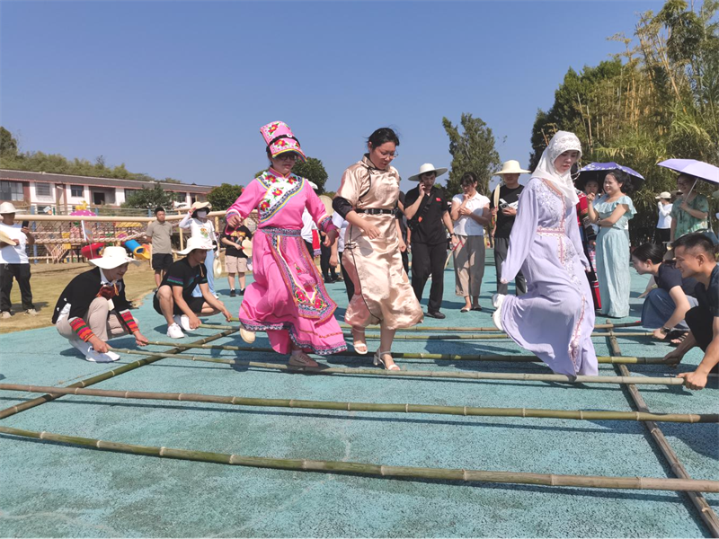 活动中,打陀螺、跳竹竿舞等富有民族特色的传统体育项目,成为了现场的一大亮点。打陀螺的选手们挥动着鞭子,精准地击打着旋转的陀螺,每一次击打都伴随着观众的欢呼声。跳竹竿舞的选手们则轻盈地在竹竿间跳跃,舞姿优美,节奏明快,让人目不暇接,为观众带来了一场视觉与文化的双重盛宴。
