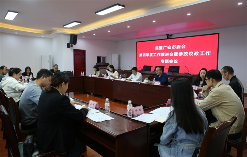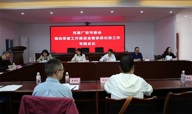 为奋力攻坚四季度,打好全年收官战,10月18日下午,民盟广安市委会组织召开第四季度工作推进会暨参政议政工作专题会。民盟广安市委会副主委、市营商环境局局长殷云,民盟广安市委会副主委、广安区人大常委会副主任罗明轩出席会议并讲话。民盟市委会秘书长王莹莹主持会议。民盟市委会副秘书长,参政议政部部分成员,各下级组织负责人和参政议政代表参加会议。