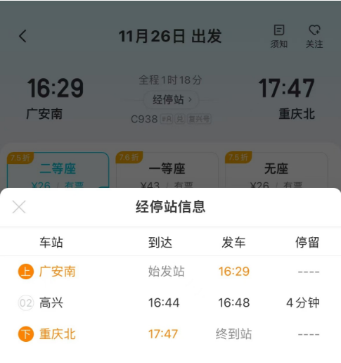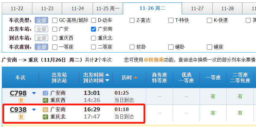 11月22日,记者从12306购票系统上查询到,广安南到重庆加开列车啦!加开的列车为C938,16:29由广安南发往重庆北,用时1小时18分,途经高兴站。