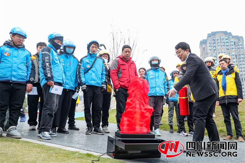 | 12月20日,四川省广安市社会保险局社保规划师在给美团、饿了么、京东等新业态从业人员,演示灭火等知识。 |