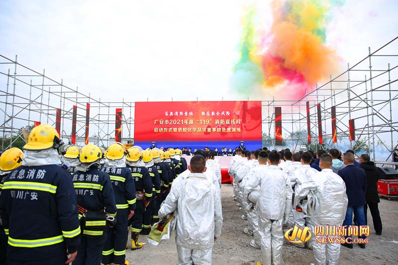 四川新闻网消息(蒋伟 记者 游伍琼 摄影报道)为进一步提升全民消防安全素质和社会抵御灾害能力,号召全市人民关注消防、参与消防、增强消防安全意识,11月8日,广安市举行2021年度“119”消防宣传月启动仪式暨危险化学品灾害事故处置演练。 广安市人民政府副秘书长徐诚,市应急管理局党委书记、市安委会办公室主任马健茗,市消防救援支队支队长杨林、政治委员黄建智出席活动。市本级、广安区消防安全重点单位代表,消防志愿者、网格员、物业服务企业代表参加活动。
