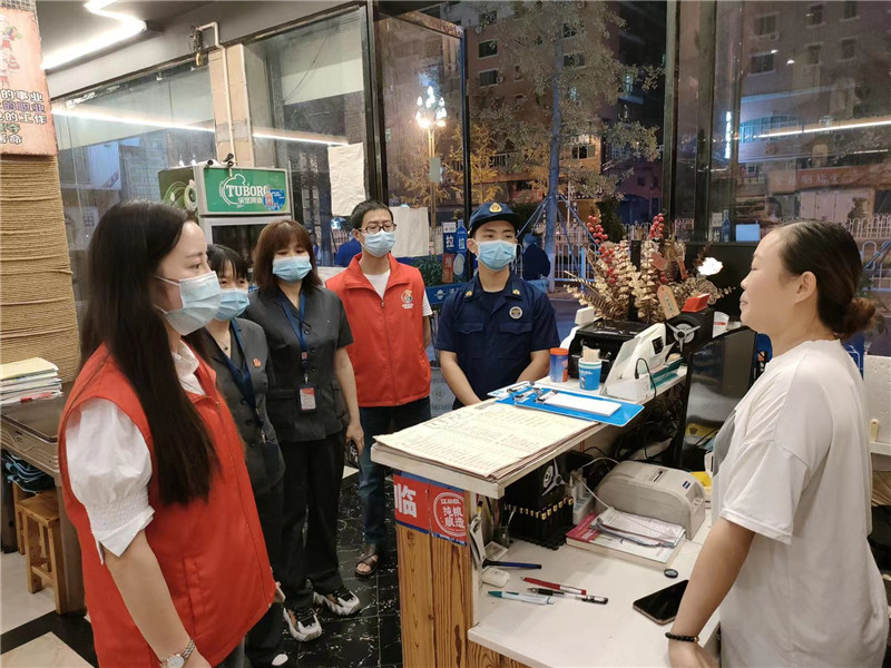 | | 图为党员先锋队的队员检查店内疫情防控情况。 |