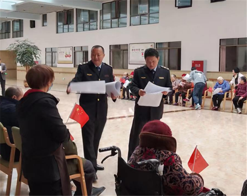 在养老院,广安经开区枣山街道的包保干部和区食安办的党员干部们发放宣传资料,耐心的向院里护工和老人们宣传食品安全知识,传递健康关怀。