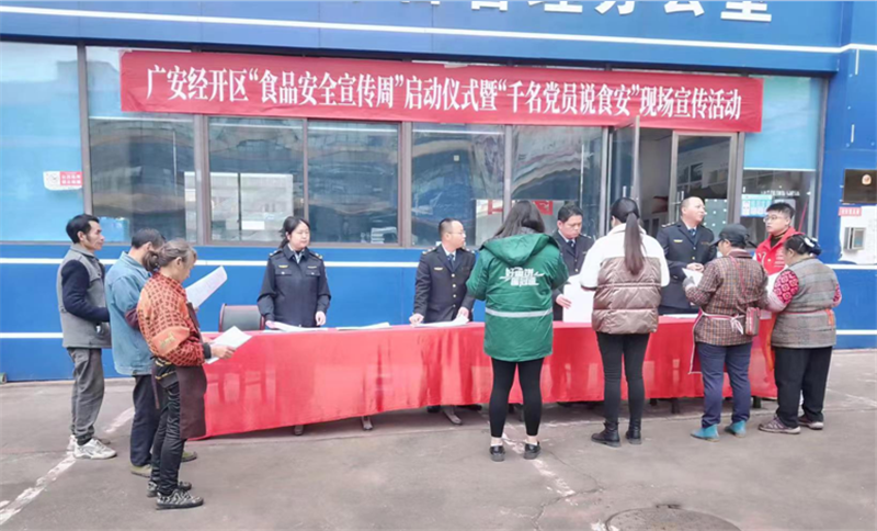在市场内,广安市市场监督管理局经开区分局党员干部组织开展了食品安全宣传周启动仪式,现场设置展示台、展板,发放《食品安全法》《反食品浪费法》等宣传资料向人民群众普及食品安全相关知识,针对人民群众关切的食品安全问题,党员干部现场耐心进行解答。