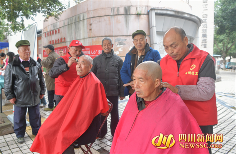 | 11月15日,广安区组织社工在北辰街道湖滨路社区为居民提供免费理发服务。 |