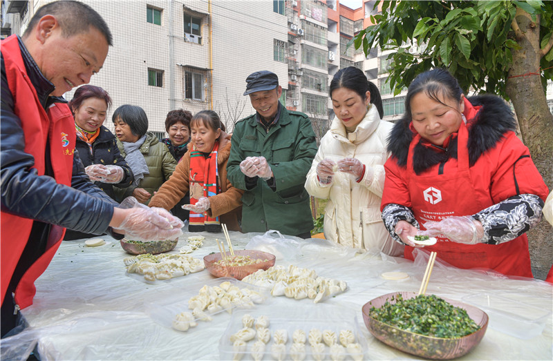 | 广安区北辰街道湖滨路社区党员志愿者、义工和斌鑫雅居园小区居民一起包饺子。 |