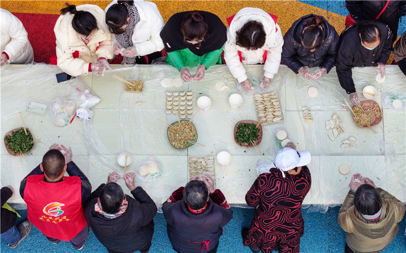 | 广安区北辰街道湖滨路社区党员志愿者和斌鑫雅居园小区居民一起包饺子。(无人机照片) |