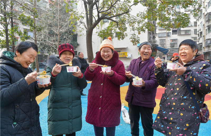 | 广安区北辰街道湖滨路社区斌鑫雅居园小区老年居民品尝热气腾腾的饺子。 |