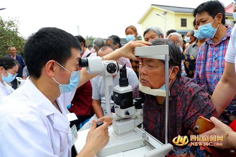| 王东在广安区大龙镇战斗村义诊,为村民检查眼睛。 |