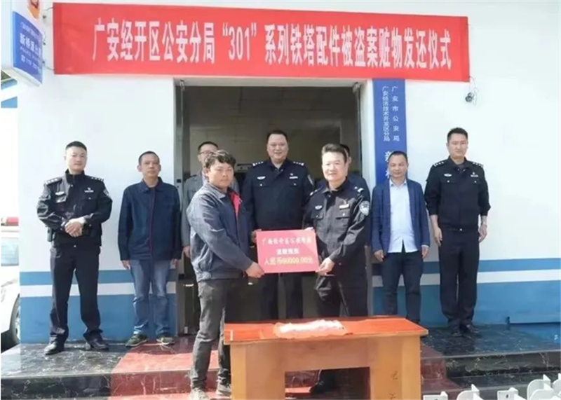 4月11日,在新桥派出所举行赃物发还仪式,现场返还给失主四川某电力有限公司现金6万元,及钢材、底板、螺丝等铁塔配件近2吨。2023年3月,刘某等人流窜至新桥街道工业园区内盗窃四川某电力公司组装电力铁塔所用的钢材等配件近2吨,给企业经营造成巨大经济损失,严重影响广安经开区“四个百亿”项目推进速度。经开公安发现后主动出击、缜密侦查,抓获犯罪嫌疑人3人,成功破获影响重大的“3.01”系列铁塔配件被盗案。