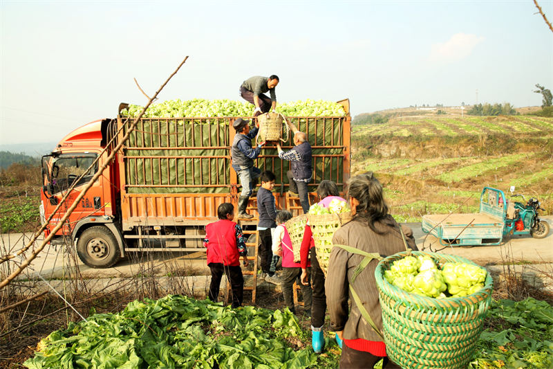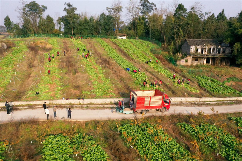 广安区彭家乡天井村种植的400余亩榨菜迎来大丰收,村民正在帮助业主收获榨菜。