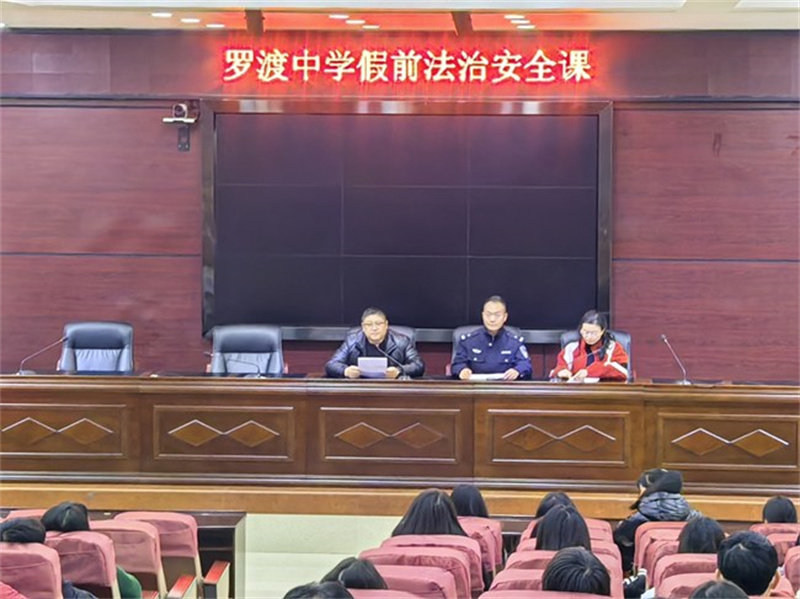 1月12日,岳池县公安局罗渡派出所法治班主任毛建平与罗渡镇人民政府、罗渡镇司法所来到罗渡中学,通过发放宣传资料、公开授课等方式,为罗渡中学学生开展法治教育。