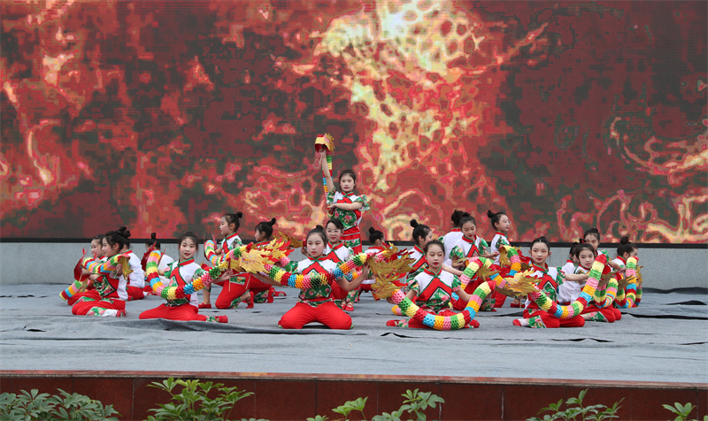 广安区东方小学四年级学生在表演龙腾盛世舞蹈《龙的传人》