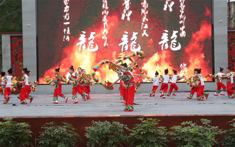 2月26日,在四川省广安市广安区东方小学校举行的春季开学典礼上,该校四年级学生在表演龙腾盛世舞蹈《龙的传人》,潜移默化激发师生龙行东方向未来热情。
