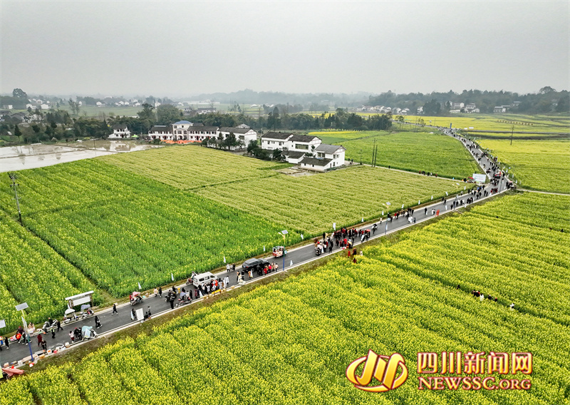 | 3月8日,在四川省广安市广安区花桥镇万亩油菜园区,相继绽放的油菜花吸引不少市民前往赏花打卡。(无人机照片) |