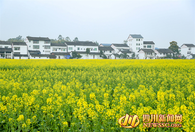 | 3月8日,在四川省广安市广安区花桥镇万亩油菜园区,相继绽放的油菜花与民居相映成景,构成一幅幅生机盎然的春日画卷。 |