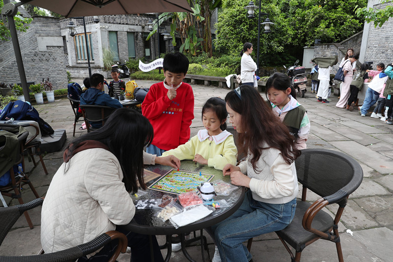 | 游客在广安区大龙镇干埝村溪贤山舍休闲下棋 |
