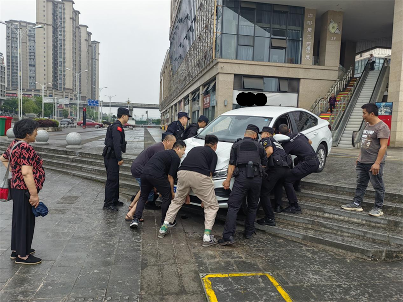 6月11日10时许,广安市公安局经开区分局特巡警大队队员在广安南站周边巡逻时,突然看见前方一辆白色小轿车卡在台阶上,动弹不得,便立即上前查看情况。经了解,车主周先生由于对地形不熟,误将台阶当成了下坡路,导致车子底盘卡在梯坎上,不能动弹。此时,周先生已急得直跺脚,不知所措。