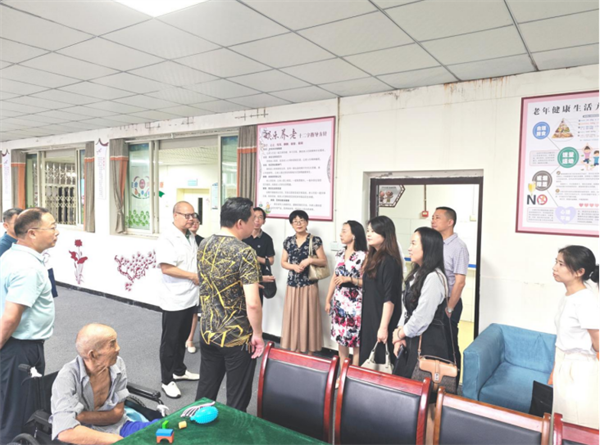 考察组一行实地考察了石垭镇中心卫生院医养结合中心、朝阳街道社区卫生服务中心医养结合中心,石垭镇中心卫生院院长严英、朝阳街道社区卫生服务中心主任曹能分别对医养结合相关工作开展情况进行介绍。医养中心主要收失智、失能、半失能的老年人,设置有健康管理、休闲娱乐、心理关爱等功能区,配有重捶式手指肌力训练桌、上肢推举训练器、肌力训练器材等康复锻炼器材,为辖区老年人提供日托、全托、按小时托养、休闲娱乐、助医、助餐、助浴、助洁等养老服务。