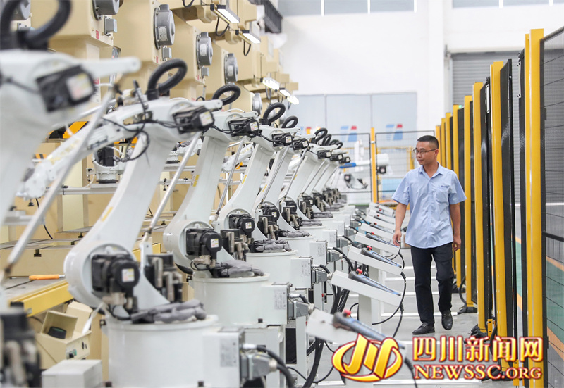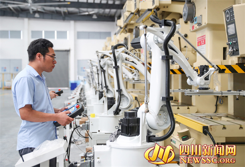 | 7月26日,在四川省广安华蓥市华蓥山经开区,从事智能化设备研发和电子信息产品生产与销售等产业的四川怡田科技有限公司的员工,在智能车间调试新安装的机器人。 |