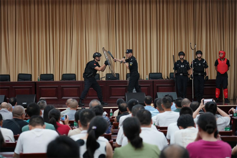 随后,特巡警大队实战教官采取理论与模拟实战对抗相结合的方式现场教学,先后演示警棍、盾牌、钢叉等安保器械的正确操作方法,传授对抗中的防护、攻击、制服、控制等“二对一”“三对一”战术要领,模拟暴恐分子持械攻击的正确处置方法,抽取各校园保安人员进行对抗学习,现场纠正指导,确保融会贯通、学以致用。