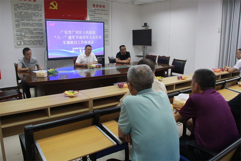 四川新闻网消息 7月31日下午,广安区人民医院在行政楼6楼会议室召开“八·一”建军节座谈会,会议由医院工会主席顾峥荣主持,医党委副书记侯兴建,党委委员、副院长杨新华以及来自各科室的退役军人及现役军人家属代表参加了座谈,共同庆祝中国人民解放军建军97周年,进一步弘扬拥军优属优良传统,凝聚退役军人蓬勃力量。