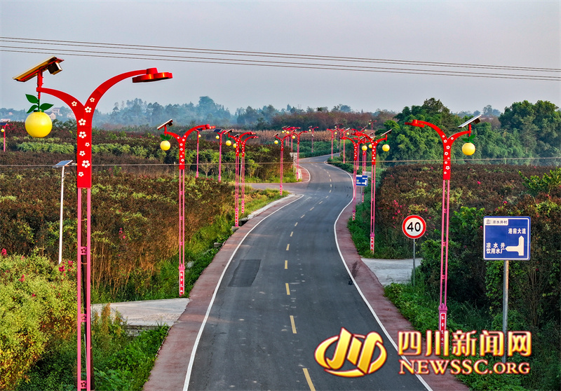 | 8月16日,四川省华蓥市禄市镇凉水井村生态园的乡村旅游公路,在鲜艳的太阳能路灯点缀下显得格外美丽(无人机照片)。 |