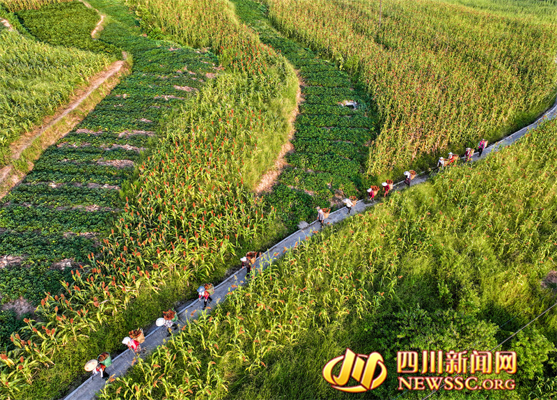 | 8月22日,四川省广安华蓥市溪口镇袁家坝村的村民在转运刚从山坡地收割的红高粱。 |