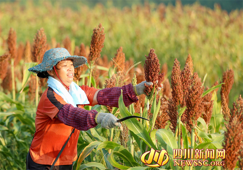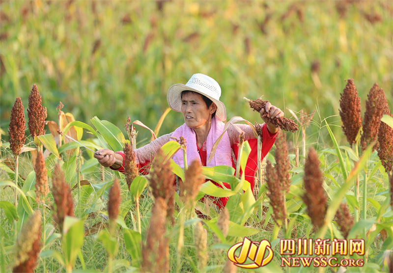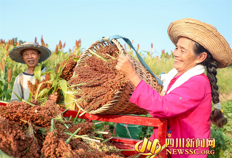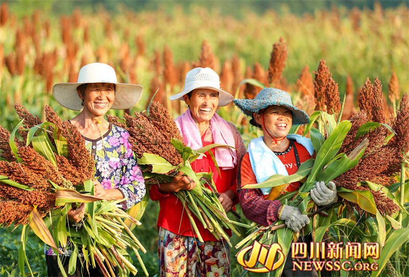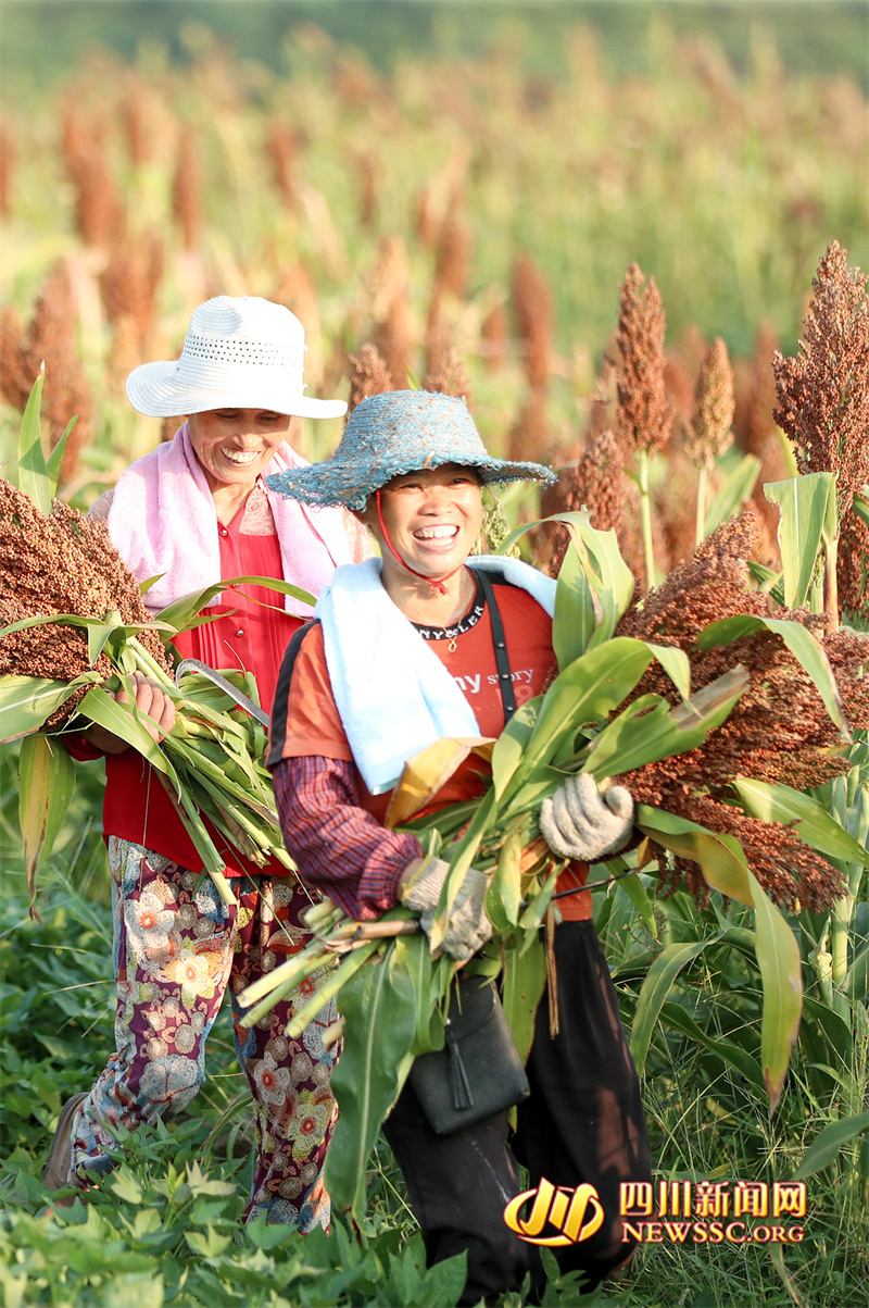 | 8月22日,四川省广安华蓥市溪口镇袁家坝村的村民在开心中展示丰收的红高粱。 |