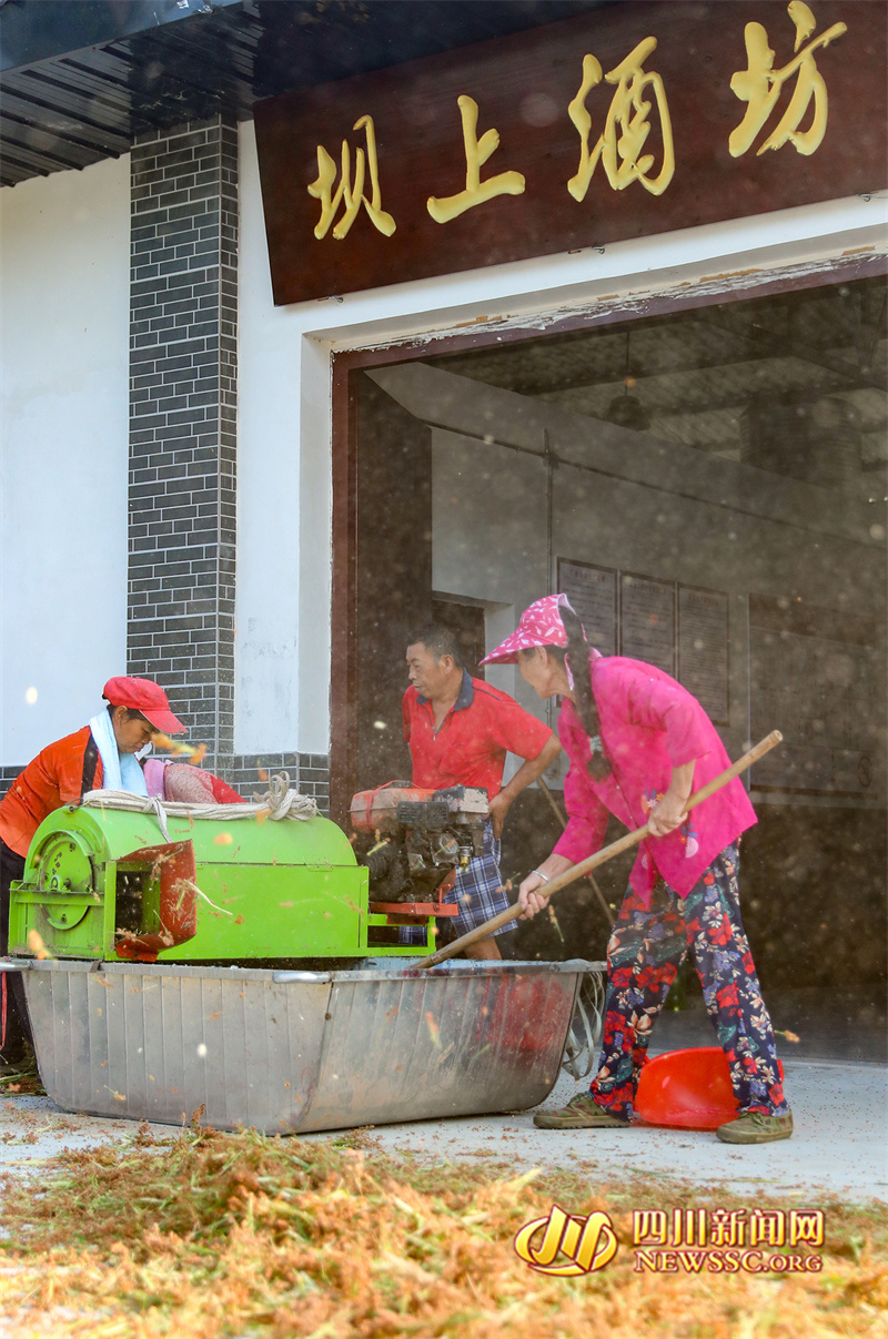 | 8月22日,四川省广安华蓥市溪口镇袁家坝村的村民,在村办酒厂现场脱粒刚收割的红高粱。 |