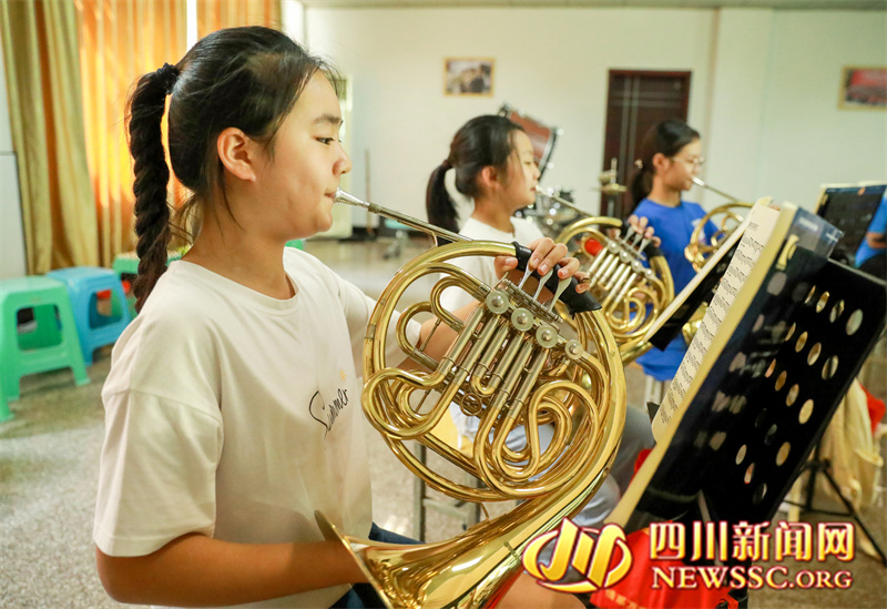 | 8月25日,四川省华蓥市双河小学“娃娃管乐团”的学生在集训圆号。 |
