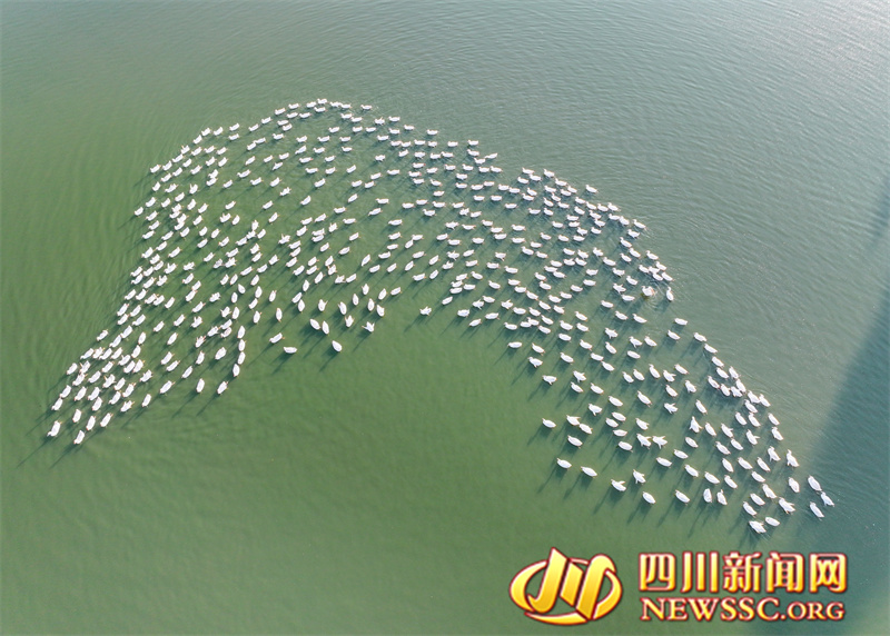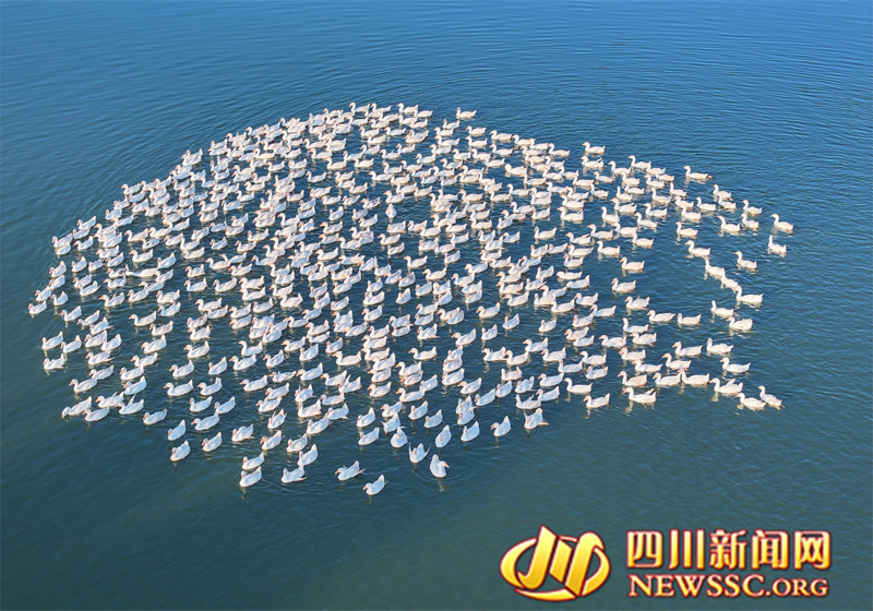 | 9月3日,四川省广安华蓥市明月镇红光村养鹅基地的白鹅在水中游玩嬉戏(无人机照片)。 |