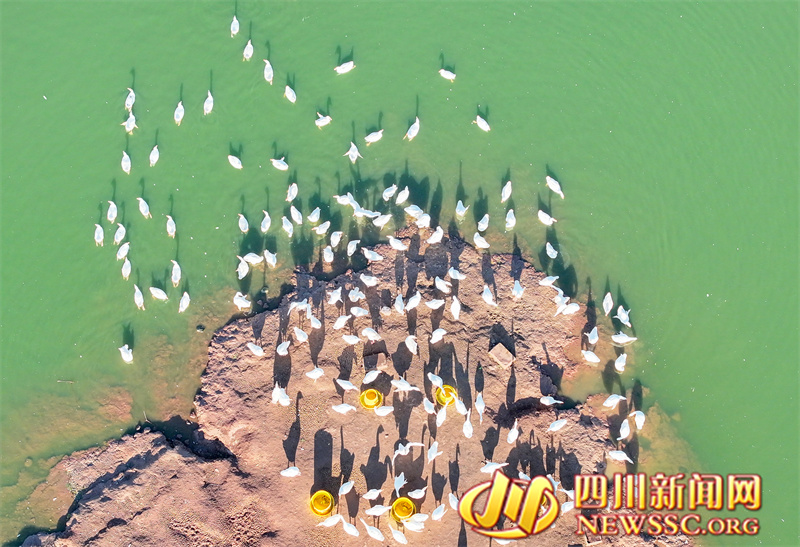 | 9月3日,四川省广安华蓥市明月镇红光村养鹅基地的白鹅在岸边进食、栖息(无人机照片)。 |