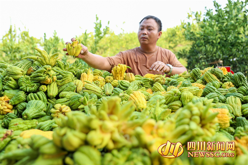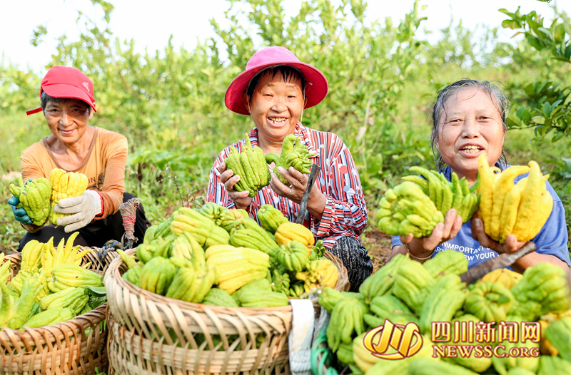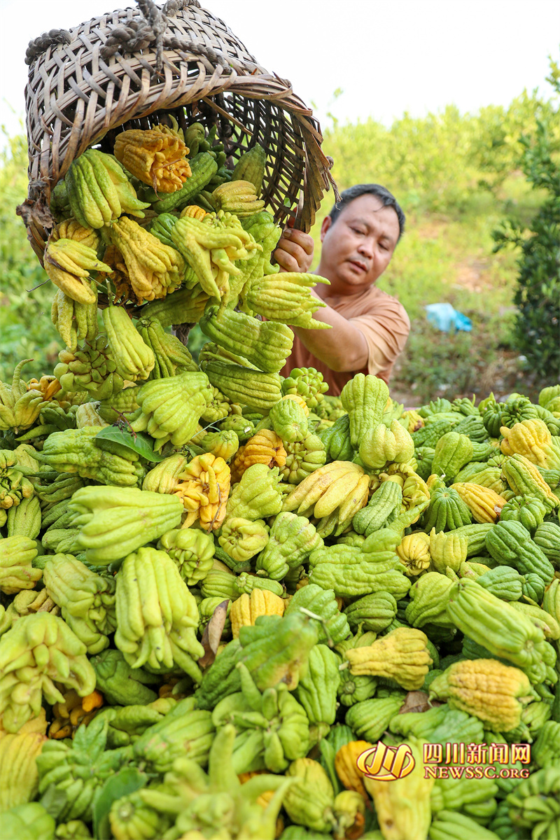 | 9月11日,四川省华蓥市庆华镇铜鼓寨村的村民,在村头的中药材基地展示刚采摘的佛手。 |