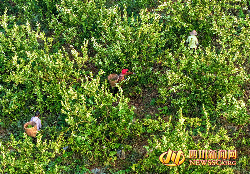 | 9月11日,四川省华蓥市庆华镇铜鼓寨村的村民,在村头的中药材基地采摘佛手(无人机照片)。 |