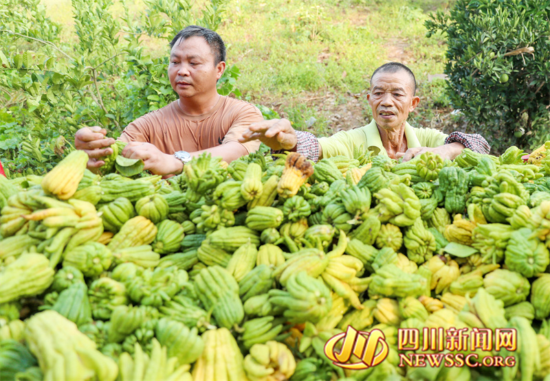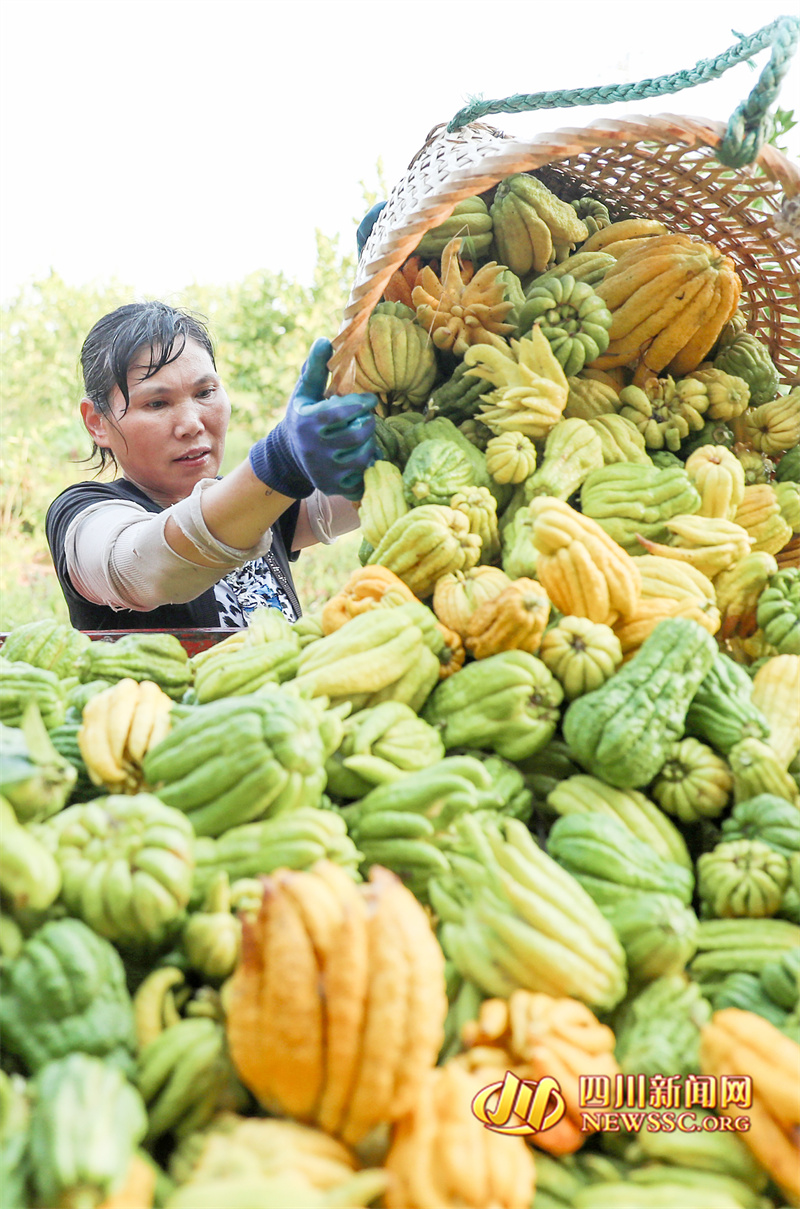 | 四川省华蓥市庆华镇富登种植专业合作的社员,在中药材基地集中装运刚采摘的佛手。 |