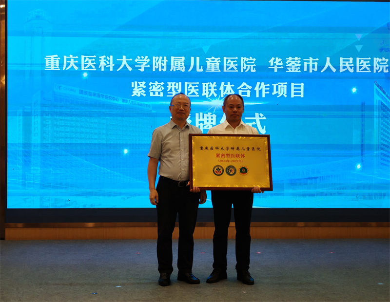 会上,重医附属儿童医院与华蓥市人民医院签订《重庆医科大学附属儿童医院与华蓥市人民医院紧密型医联体合作项目一期协议》,重医附属儿童医院纪委书记余平向华蓥市人民医院授予“重庆医科大学附属儿童医院紧密型医联体”牌匾。按照协议要求,为认真贯彻落实《深化医药卫生体制改革2024年重点工作任务》,主动融入成渝双城经济圈国家战略,纵深推进川渝地区儿科高质量发展,根据有关法律法规,本着平等自愿、互惠互利、合作共赢的原则,重庆医科大学附属儿童医院与华蓥市人民医院开展紧密型医联体合作项目,将在管理理念、专业技术、人才交流等方面开展深层次合作,即重庆医科大学附属儿童医院根据华蓥市人民医院的实际需求,充分发挥重庆医科大学附属儿童医院在技术、人才、品牌、管理等方面的优势,重点在学科建设、人才培养、远程医疗和信息化建设加强交流合作,全面提升华蓥市人民医院儿科诊疗能力,让当地儿童在家门口就能享受到一流的儿童医疗资源,为推进成渝经济双城圈建设贡献应有的力量。