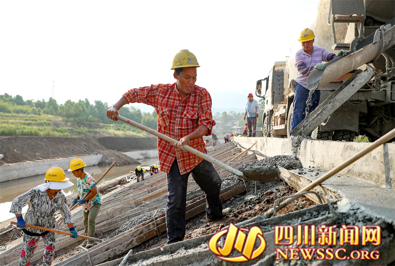| 9月24日, 在四川省华蓥市庆华镇庆观河实施的堤防(河道整治)工程现场,民工正在给河堤浇筑混凝土。 |